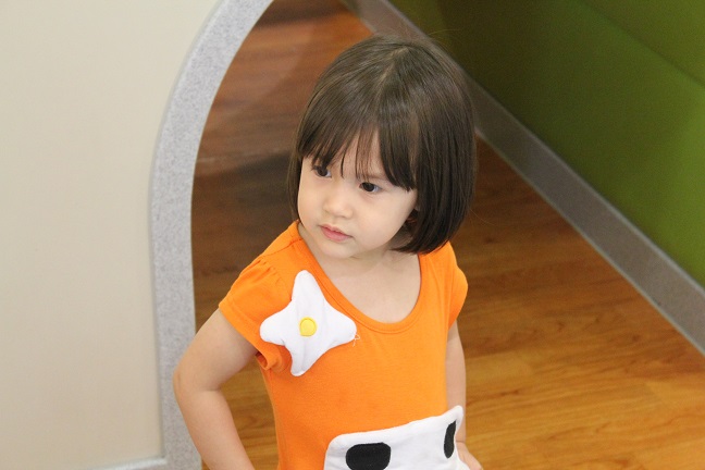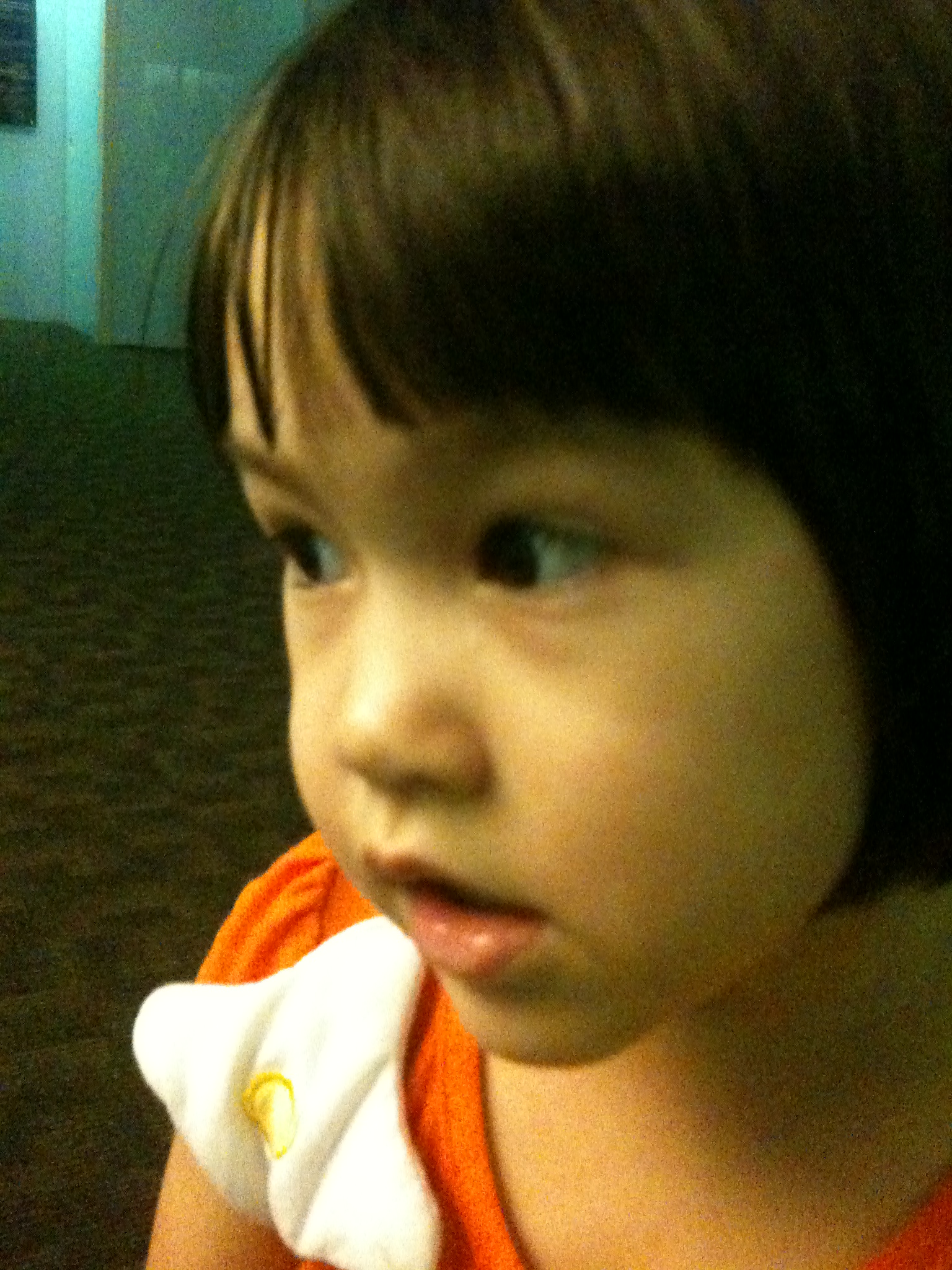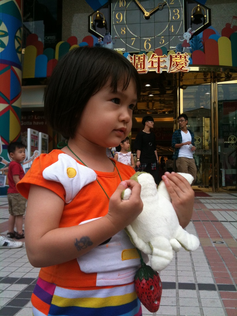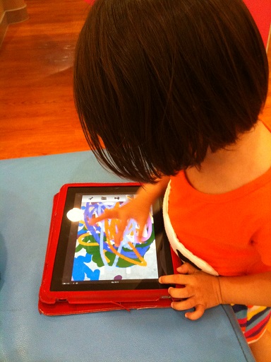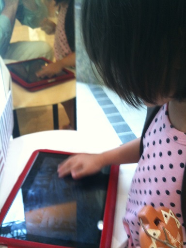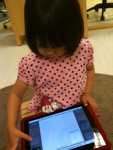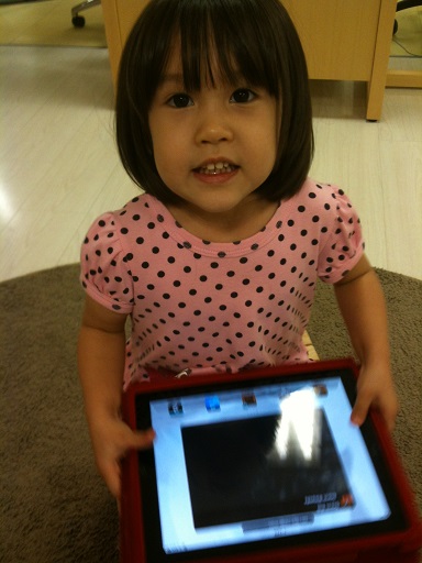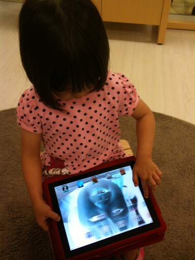 It is in her nature to share She learns fast She loved hugging those stuffed vegetables with Daddy She taught me that pressing the iPad button three times inverts the colors See?